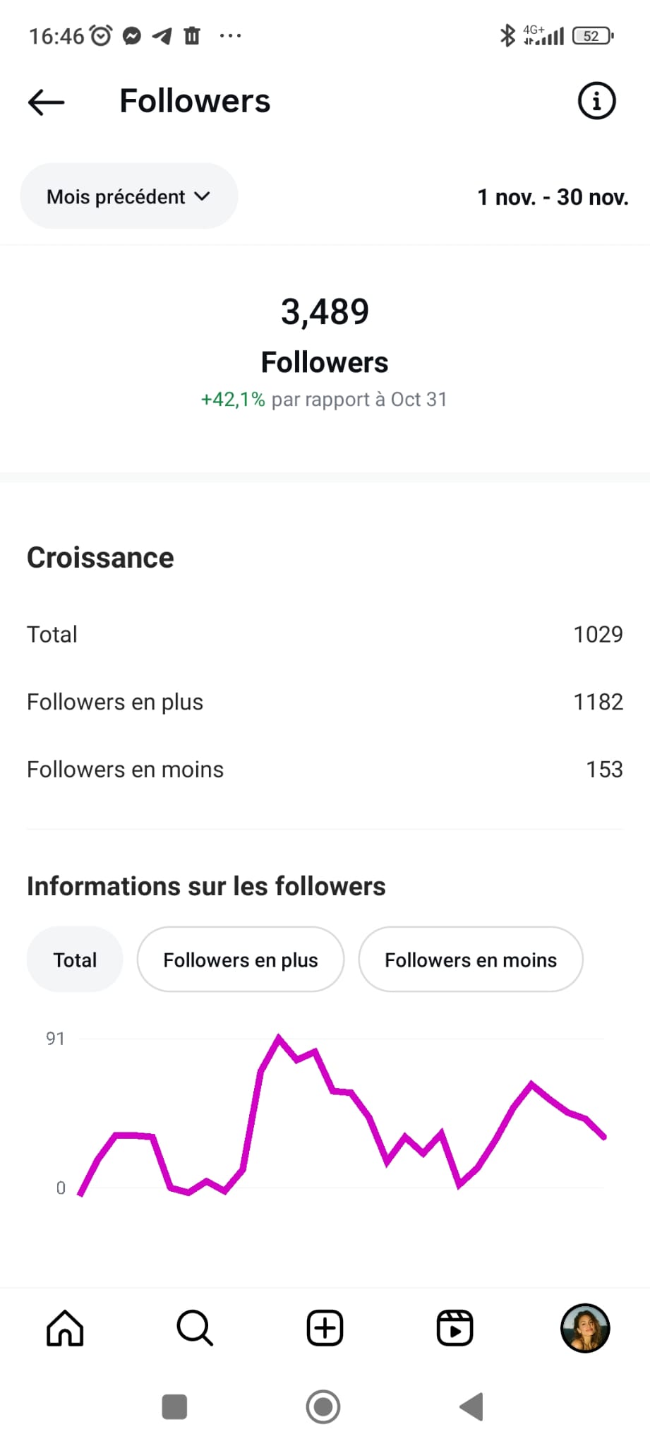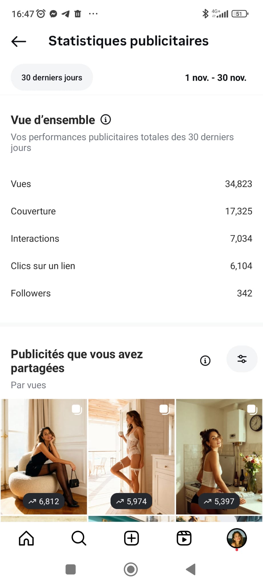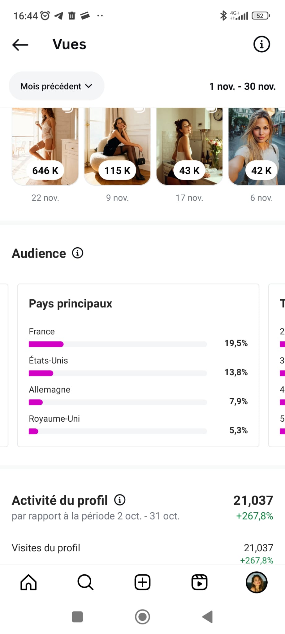 Voici un exemple concret des résultats obtenus après 90 jours d’exploitation du modèle virtuel présenté ci-dessus, puis au cours du 6e mois, période durant laquelle deux publications sont devenues virales. Le compte Instagram a été lancé de zéro, sans audience préexistante, avec un budget publicitaire modeste de moins de 6€ par jour.